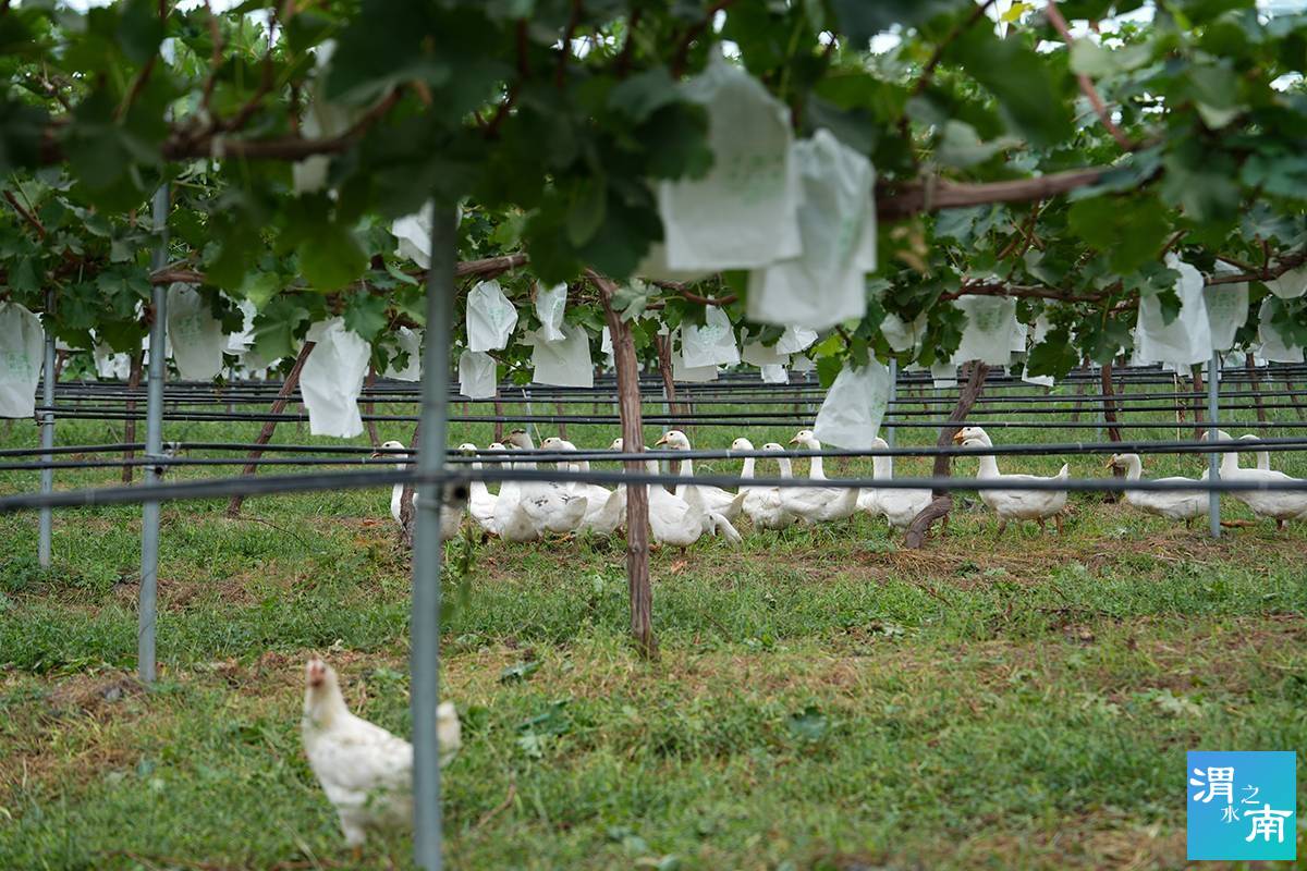 為了種出健康果,基地在源頭下足了功夫:灌溉用的是三張鎮水庫的天然水,施肥全程用德龍菌肥和生物有機肥,還特意邀請了業內專家陳建增教授給予技術指導,從葡萄抽枝到掛果,生長周期管理、病蟲害防控全按科學方案來。更有意思的是,園子里還散養著一群雞和鵝,它們在葡萄架下啄蟲、松土,成了不用工資的“生態幫手”。 也正因如此,這里的葡萄能自然著色,每一顆的成熟度、甜度都保持一致,無公害的品質成了最大賣點。