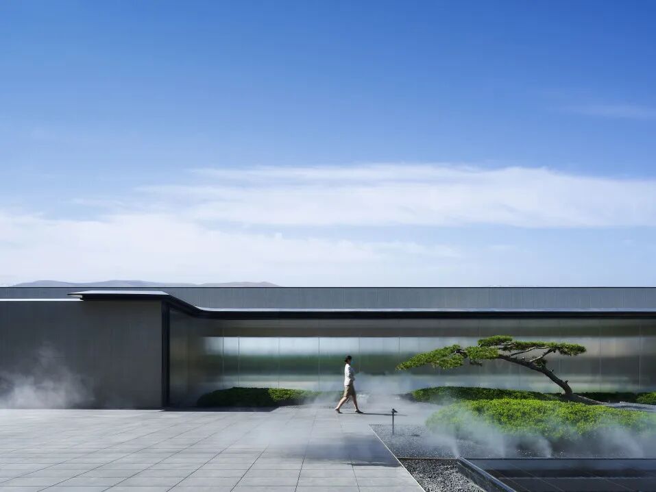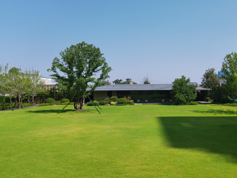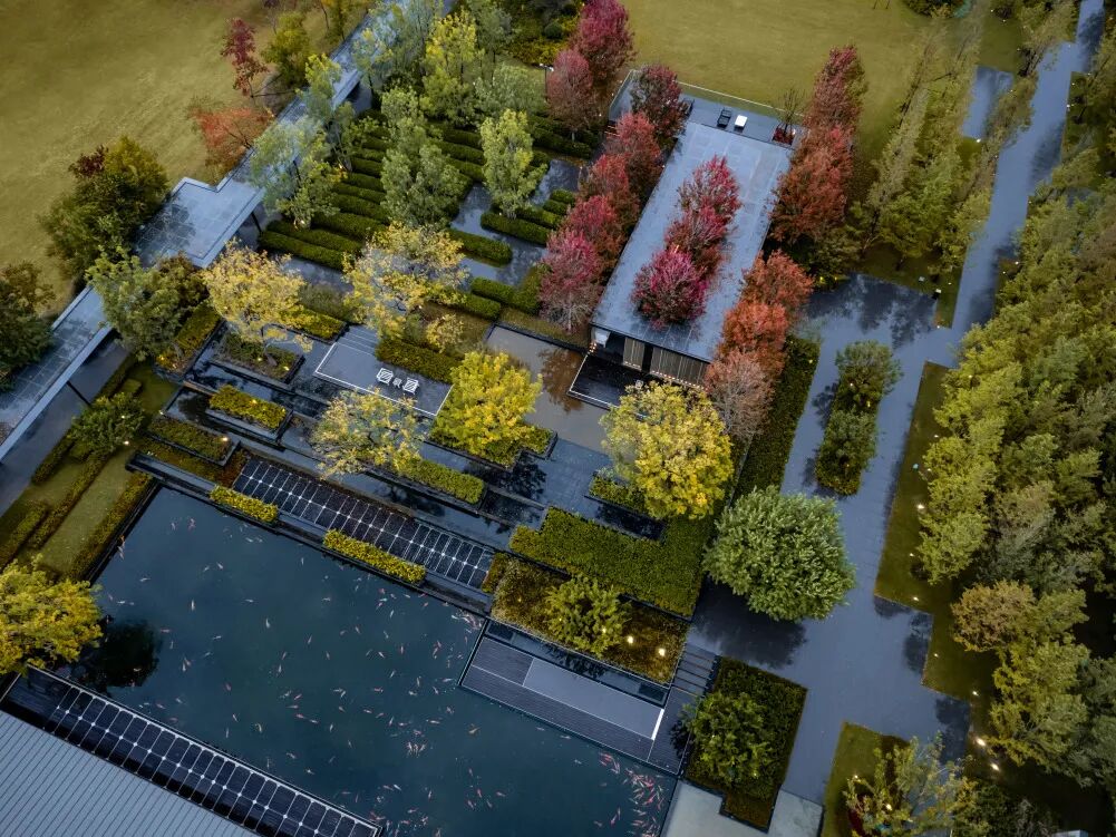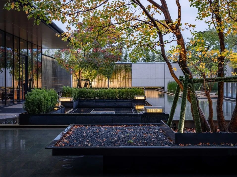 綠意盎然,中央會客廳坐落其間。樹影婆娑,流水潺潺,處處生機盎然。