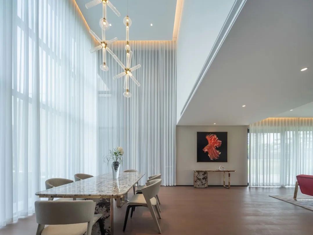約6.6米墅境高廳視野開闊,全景落地窗引光入室,270°環幕端廳每一面都是風景,戶戶空中露臺延伸生活的詩意。