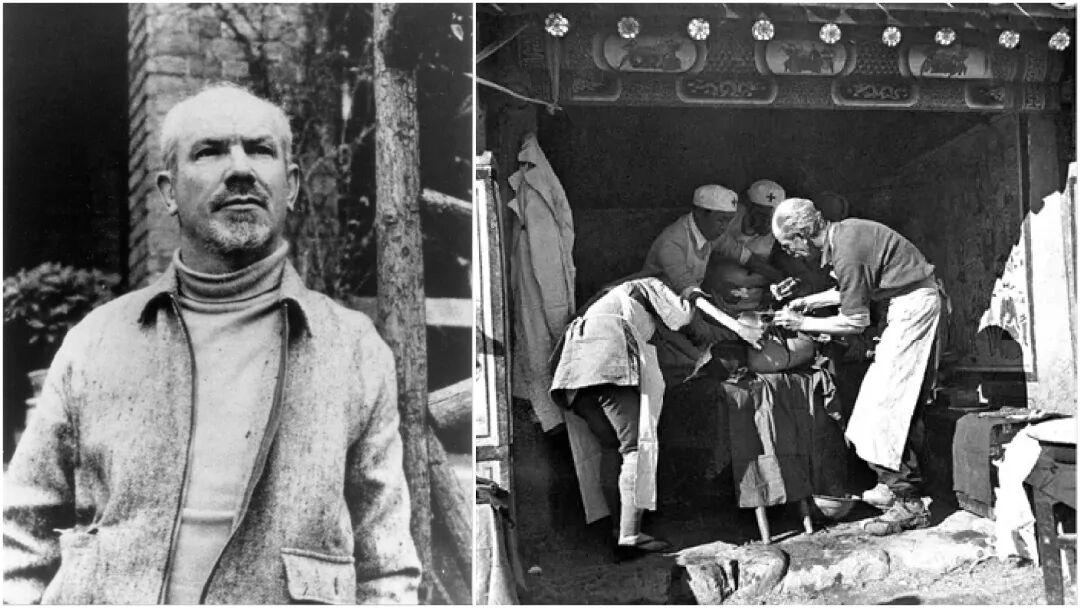 左圖是白求恩,右圖是白求恩在晉察冀邊區淶源縣臨時手術室里為傷員做手術。