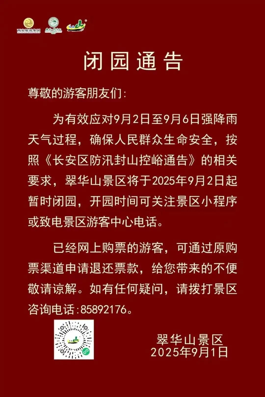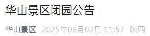根據氣象部門預報,華山景區有強降雨天氣過程。為確保安全,經研判,決定自今日(9月2日)18時起閉園。開園時間將在景區具備運營條件后另行通知。已預約購票游客可在原購票渠道申請退票,感謝您的理解與支持。
