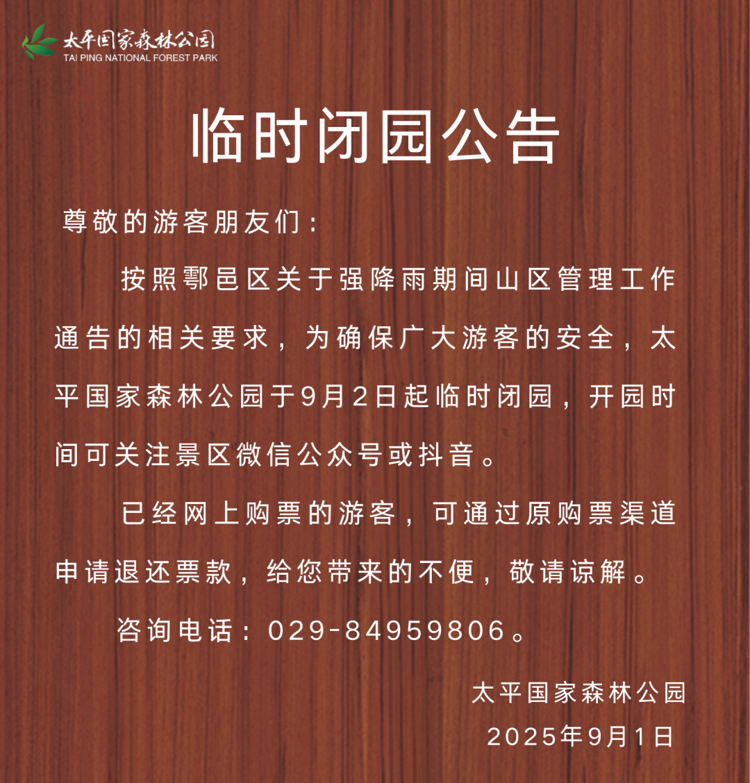 因封山控峪,朱雀國家森林公園于9月2日-6日臨時閉園,開園時間請留意公眾號或官方抖音號。已網上購票的游客,可通過原購票渠道申請退款,給您帶來不便,敬請諒解!