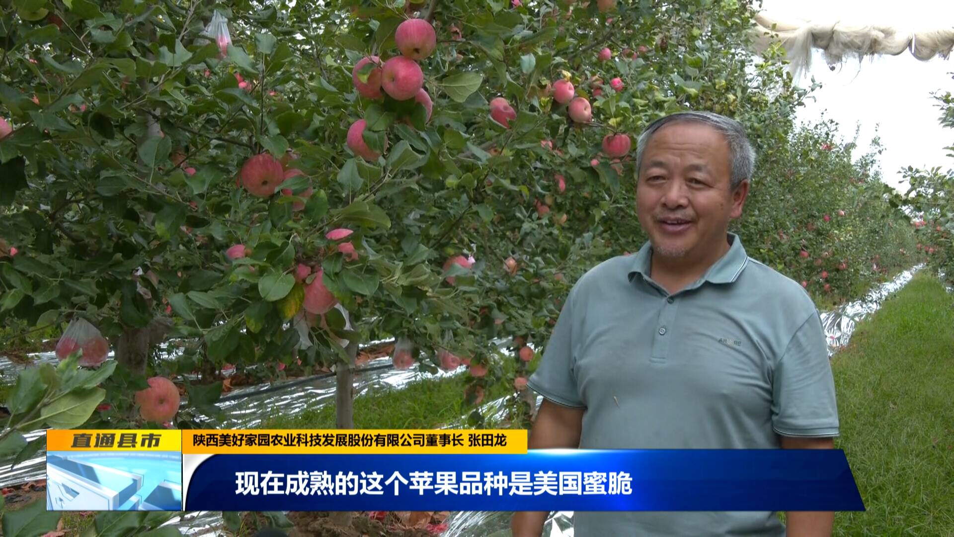陜西美好家園農業科技發展股份有限公司董事長 張田龍:“現在成熟的這個蘋果品種是美國蜜脆,咱們美好家園整個采取的是國家綠色生產標準,這個果子主要特點是有種蜂蜜的味道,也很脆,甜中帶酸,非??煽?。”