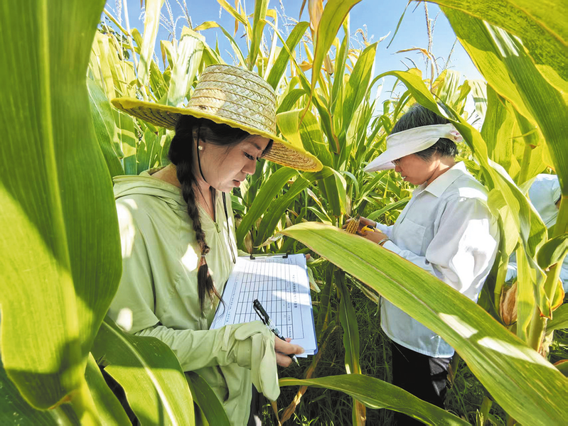 縣農(nóng)業(yè)技術(shù)推廣中心技術(shù)人員進(jìn)行玉米預(yù)測(cè)產(chǎn)調(diào)查。