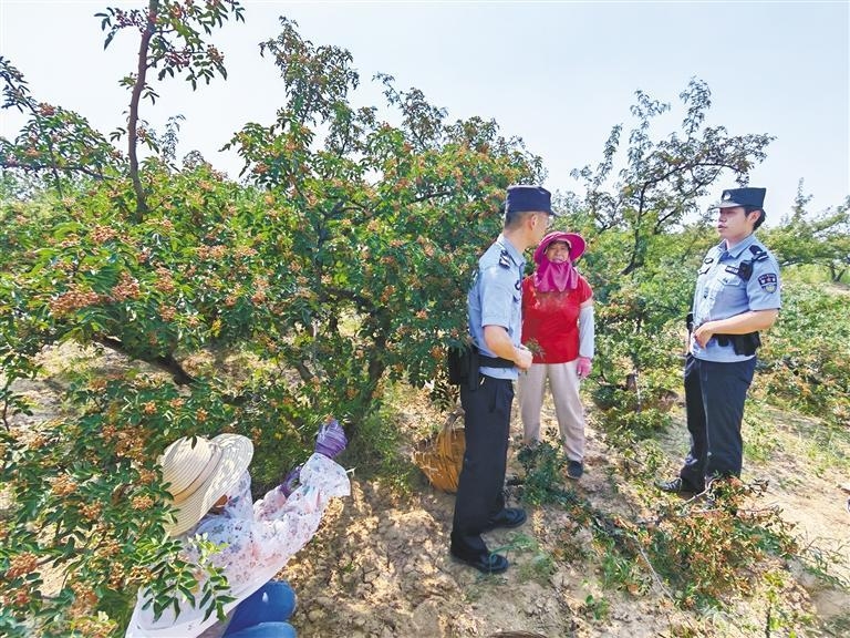 8月22日,在韓城市芝陽鎮清水村的椒園里,韓城市公安局芝陽派出所民警正帶著網格員巡邏。“現在有民警巡邏,心里踏實。”椒農陳建國一邊采摘著花椒,一邊笑著說。