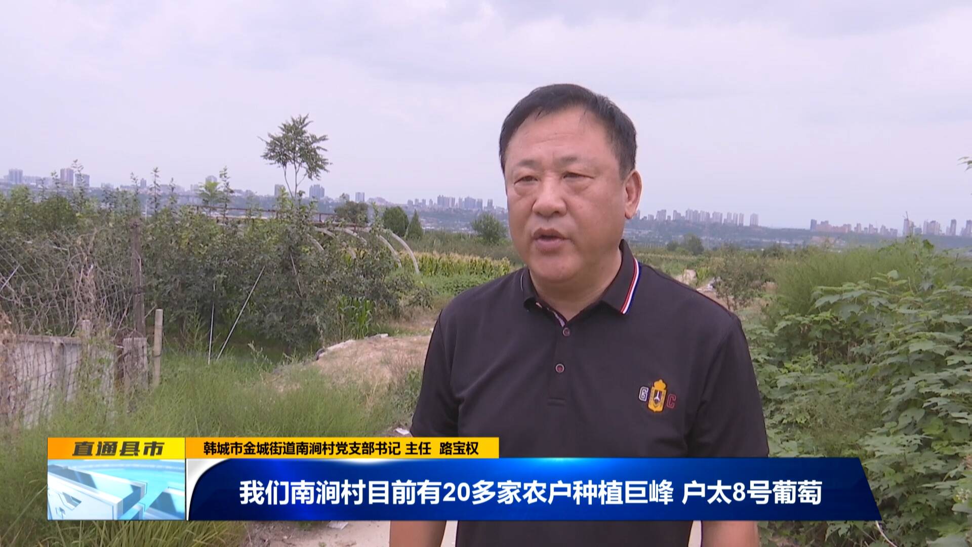 韓城市金城街道南澗村黨支部書記 主任 路寶權:“我們南澗村目前有20多家農戶種植巨峰、戶太8號葡萄,我們發展采摘加線上直播銷售,效益很好,越來越多的農民加入葡萄種植行列,增收致富?!?/p>